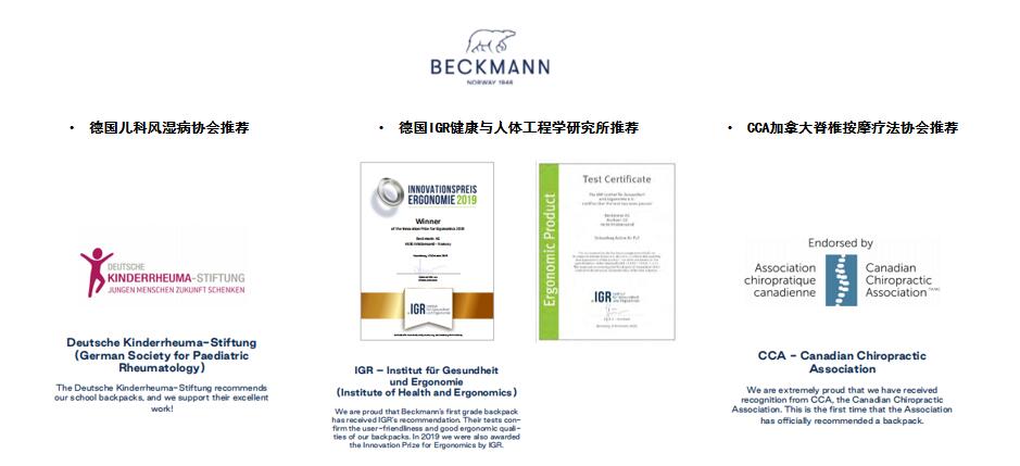 作為全球“專業(yè)”學(xué)生護(hù)脊書包的品牌之一,Beckmann貝克曼擁有75年的專業(yè)護(hù)脊書包經(jīng)驗(yàn)。自1946年Olav Beckmann先生于挪威克里斯蒂安桑Kristiansand創(chuàng)立品牌以來 ,秉持“被學(xué)生喜愛、被家長(zhǎng)信任”的品牌理念和“做全世界最好的學(xué)生背包”的愿景,Beckmann一直致力于設(shè)計(jì)開發(fā)符合人體工程學(xué)的學(xué)校背包,為學(xué)生護(hù)脊減負(fù),并不斷推出適用于更多年齡段的優(yōu)勢(shì)書包及配套設(shè)備,產(chǎn)品獲得各項(xiàng)國(guó)際專業(yè)獎(jiǎng)項(xiàng)認(rèn)可,深受學(xué)生家長(zhǎng)的喜愛與信賴。