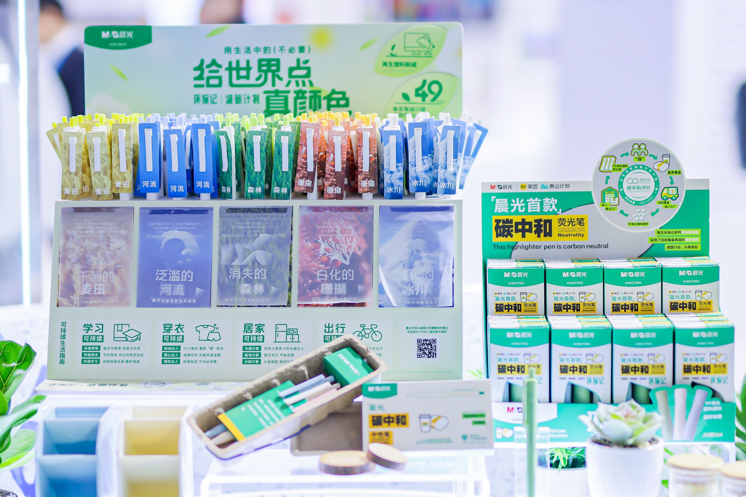 展會現(xiàn)場,晨光帶來的一系列綠色創(chuàng)新文具引發(fā)關(guān)注,如攜手美團(tuán)“青山計(jì)劃”,將廢棄餐盒回收利用打造的首款碳中和文具,并憑此綠色創(chuàng)新設(shè)計(jì)理念榮獲“2023 思誕行綠色獎(jiǎng)”;將廢舊液晶電視回收再生,每支中性筆可為世界減少碳排放49gCO2e的環(huán)保記-減碳計(jì)劃系列;將甘蔗、小麥、杉木等植物殘?jiān)谌牍P桿,呼吁大眾保護(hù)生物多樣性的瀕危動物海洋系列......