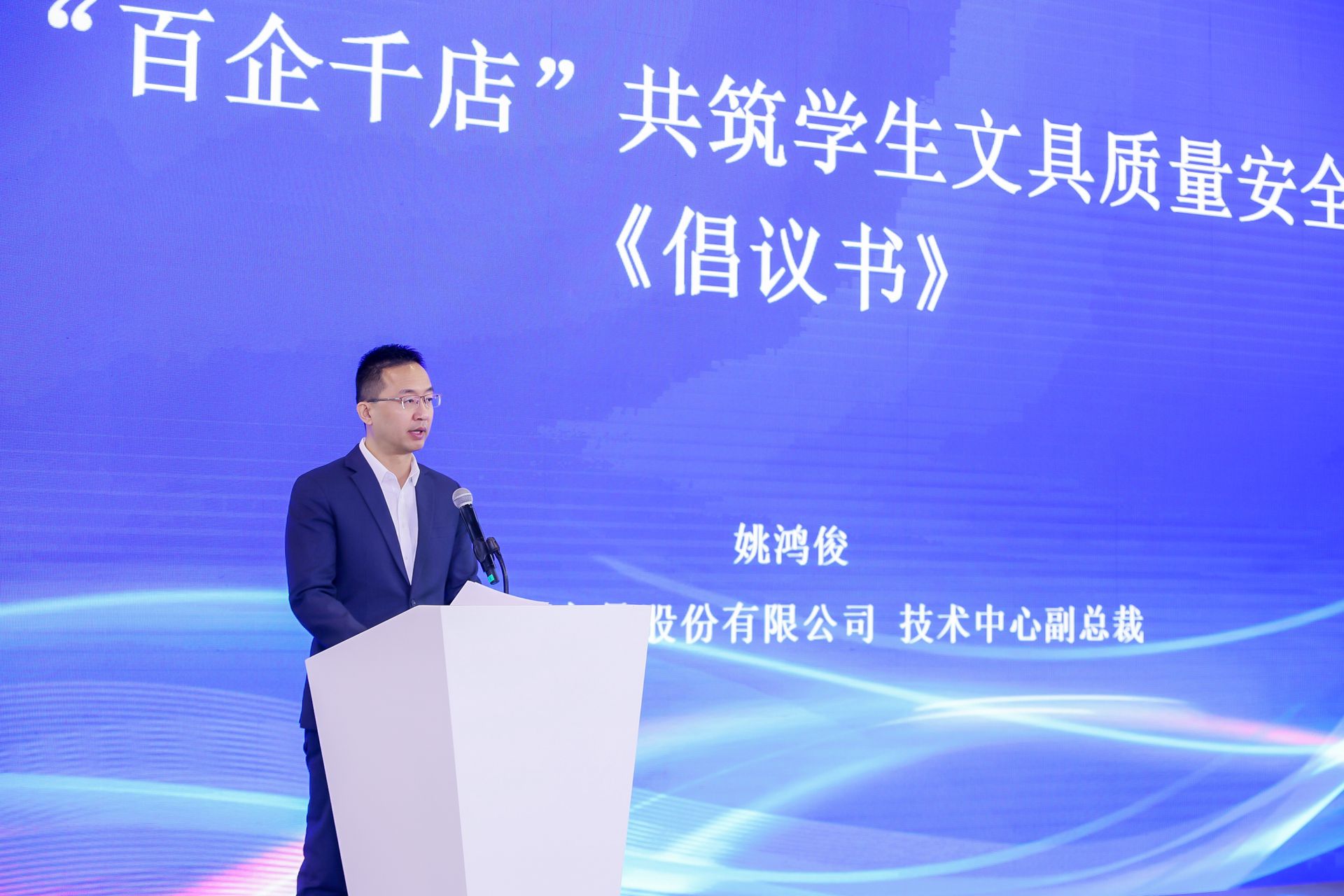 上海晨光文具股份有限公司副總裁姚鴻俊作為專委會企業(yè)代表上臺宣讀《‘百企千店’共筑學(xué)生文具質(zhì)量安全活動倡議書》。