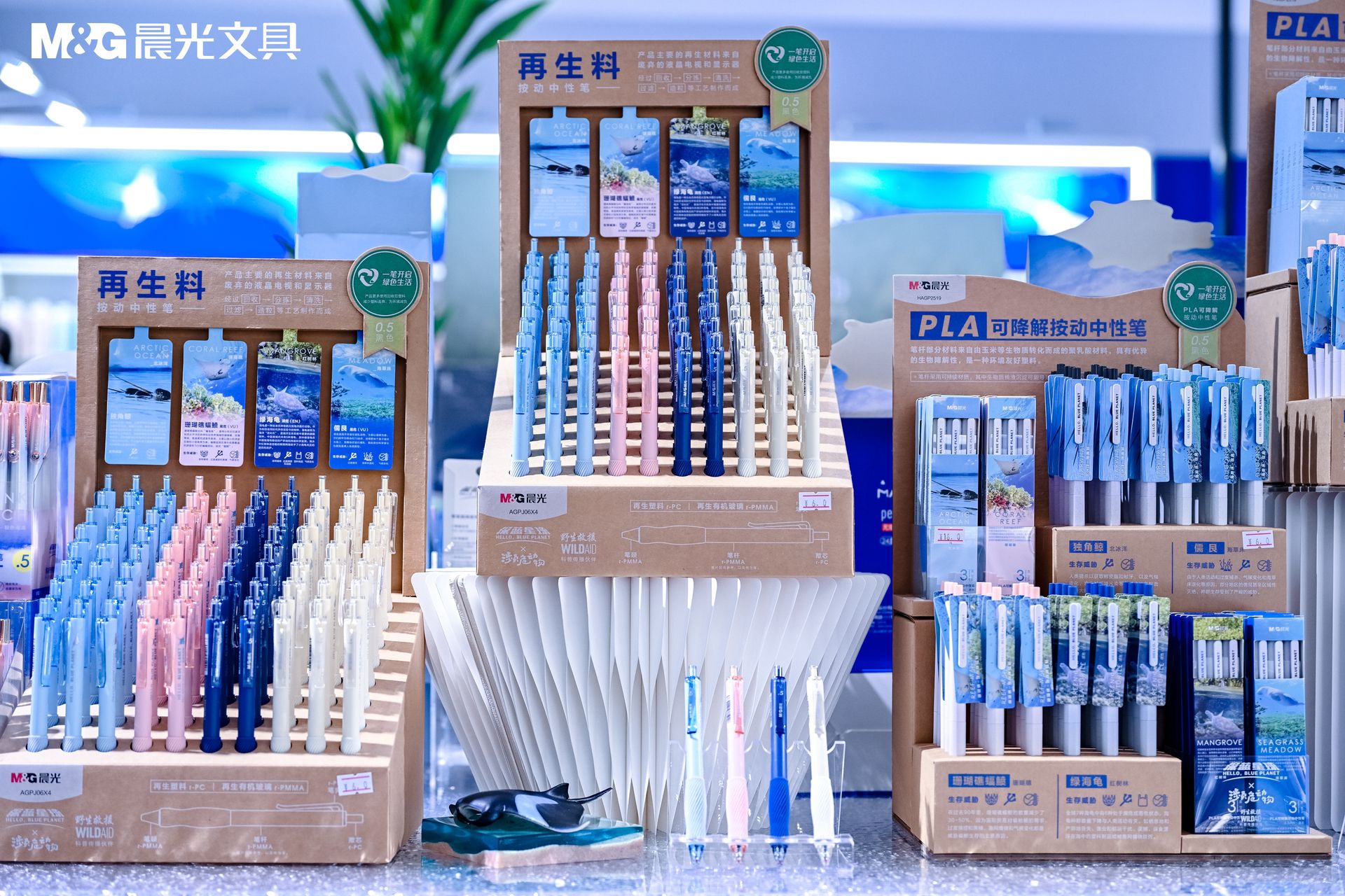 近年來,晨光持續(xù)關(guān)注可持續(xù)議題,積極尋求可再生、可降解及更安全健康的原材料,讓文具也能為改善地球的生存環(huán)境貢獻(xiàn)自己的力量。今年開學(xué)季,晨光推出“深藍(lán)星球”系列,筆身印有蝠鲼、獨(dú)角鯨、儒艮、綠海龜?shù)群Q髣游铮宫F(xiàn)珊瑚礁、極地冰川、粉色海灘、紅樹林等海洋生態(tài),讓更多人認(rèn)識并關(guān)注生物多樣性保護(hù)。該系列中的PLA 可降解中性筆采用玉米等生物質(zhì)轉(zhuǎn)化而成的聚乳酸制作而成,再生料中性筆則是采用廢棄液晶電視和顯示器,經(jīng)過回收、分揀、清洗、過濾、造粒等工藝制作而成,減少塑料廢棄物和塑料污染,以實(shí)際行動保護(hù)瀕危動物。